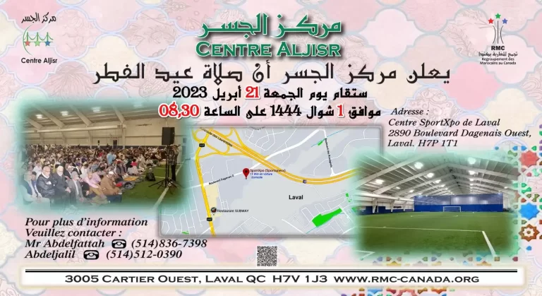 La prière du EID sera effectuée à 8h30 le vendredi 21 avril 2023  au Centre SportXPO de Laval situé au 2890 Boulevard Dagenais Ouest, Laval, H7P 1T1.