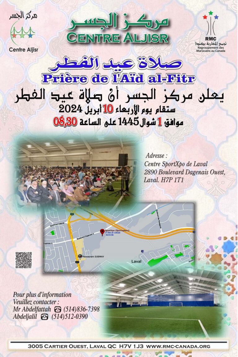 La prière du EID sera effectuée à 8h30 le mercredi 10 avril 2024  au Centre SportXPO de Laval situé au 2890 Boulevard Dagenais Ouest, Laval, H7P 1T1.
