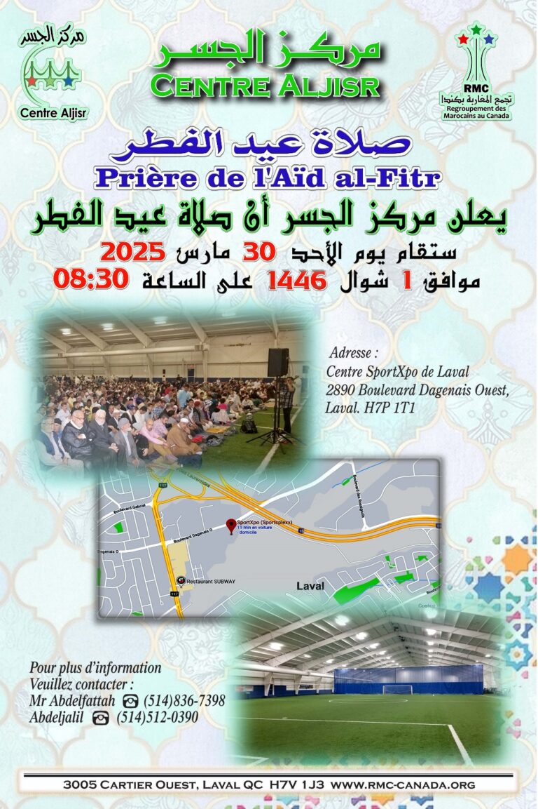 La prière du EID sera effectuée à 8h30 le dimanche 30 mars 2025 au Centre SportXPO de Laval situé au 2890 Boulevard Dagenais Ouest, Laval, H7P 1T1.