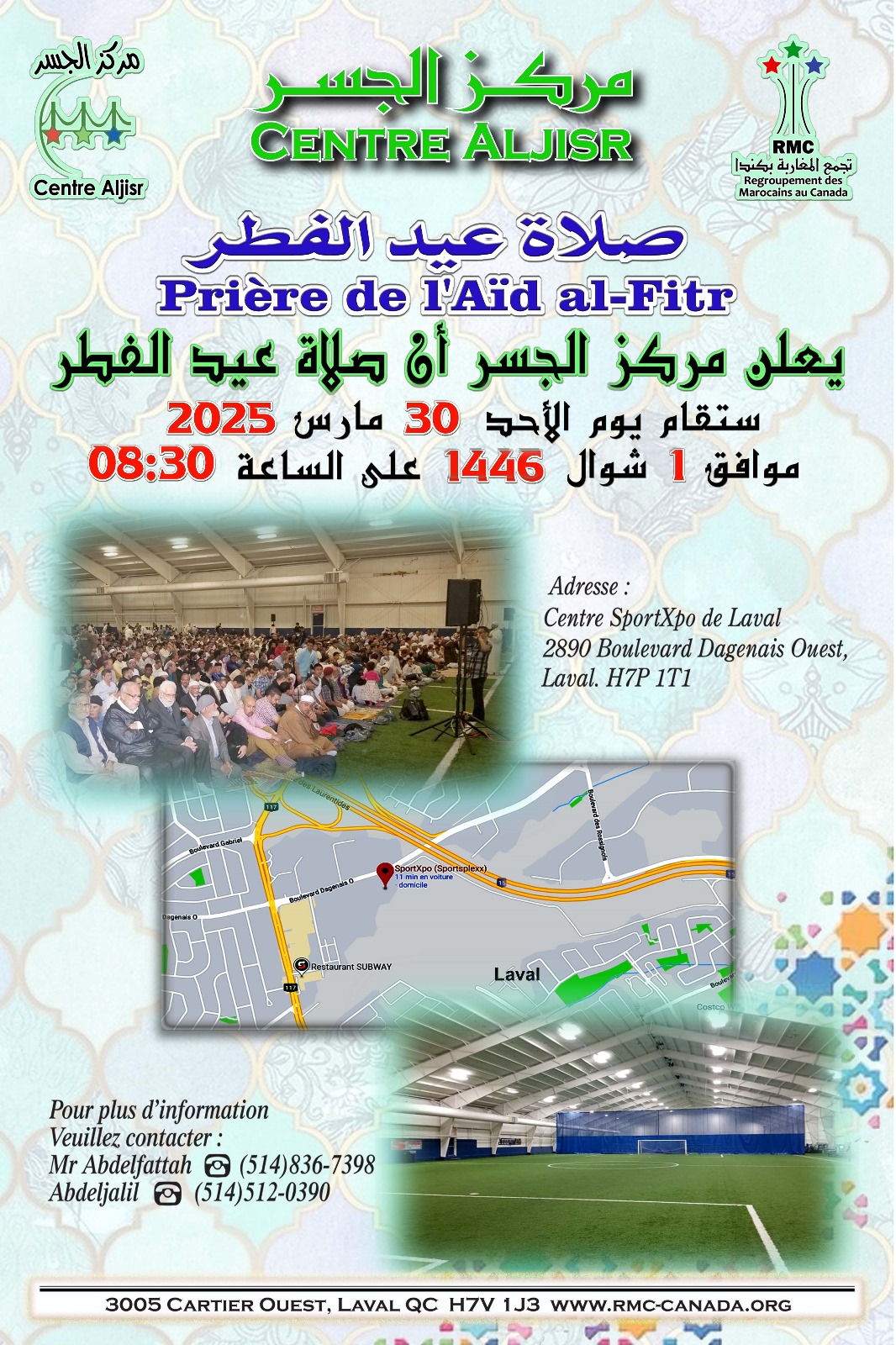 The EID prayer will be performed at 8:30 a.m. on Sunday March 30, 2025 at the Center SportXPO de Laval located at 2890 Boulevard Dagenais Ouest, Laval, H7P 1T1.