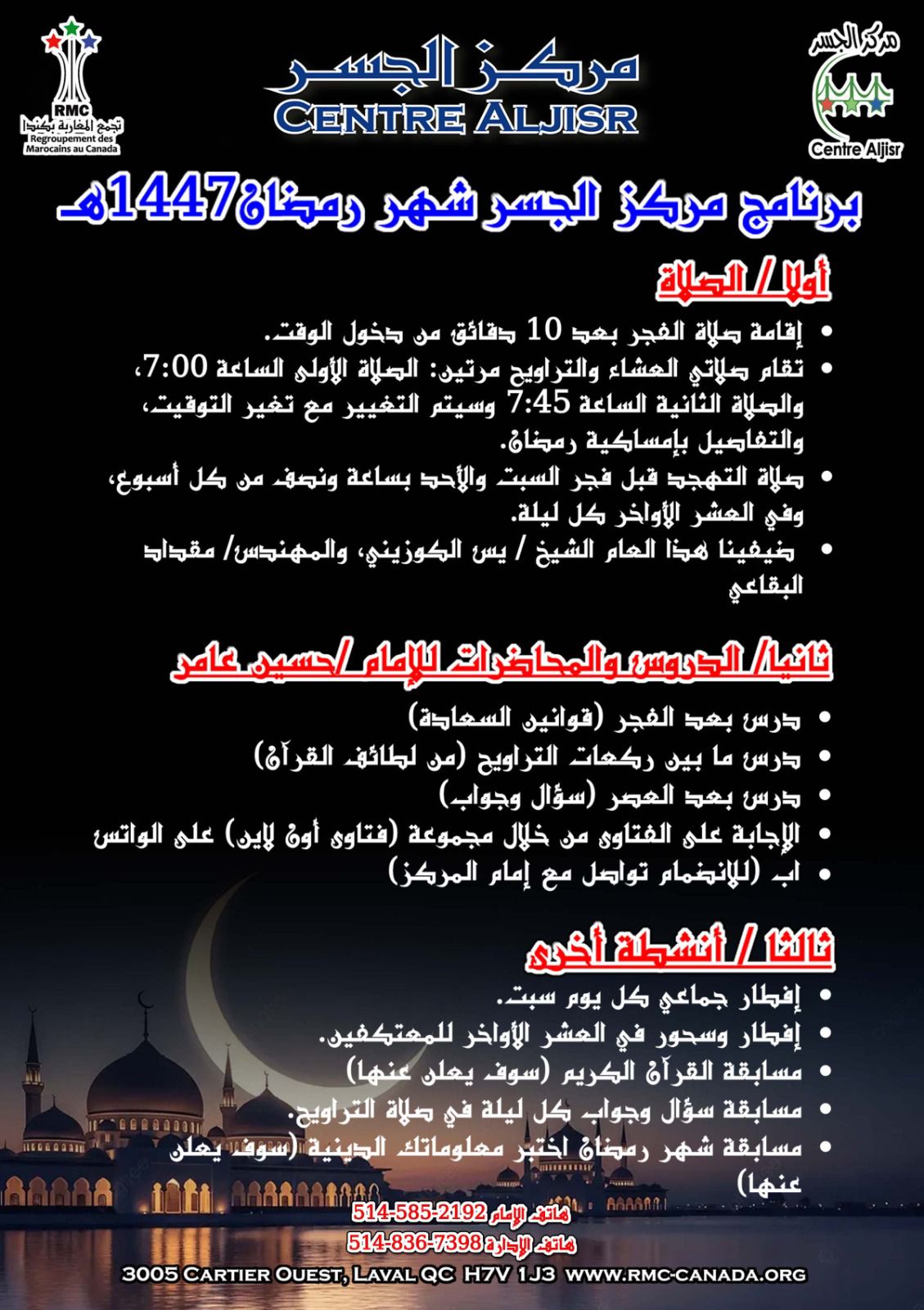 بناءً على المعايير العلمية والفقهية المعتمدة لدى المجمع الفقهي لأمريكا الشمالية (The Fiqh Council of North America – FCNA)، والتي تتبنى الحساب الفلكي القطعي كمنهجية لتحديد إمكانية رؤية الهلال، يُعلن مركز الجسر بمدينة لافال ما يلي: